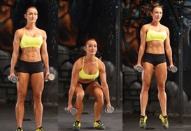 2. И.п. — глубокий присед, упор на носках, в руках гантели по 4-10 кг каждая или гриф штанги. Выпрыгивания. Повторить 8-12 раз. Не наклонять плечи вперед. Туловище прямое. Акцент на выполнении заключительной части отталкивания. Выполнять в среднем темпе с ускорением в момент выпрыгивания.