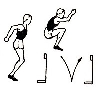 3. И.п. — встать на двух ногах, несколько согнутых в коленях. Прыжки с преодолением поочередно 4-8 барьеров, расположенных на расстоянии 90-120 см один от другого. Отталкиваться двумя ногами. Повторить 3 раза. При прыжке через барьер туловище держать прямо. Выполнять в среднем темпе.