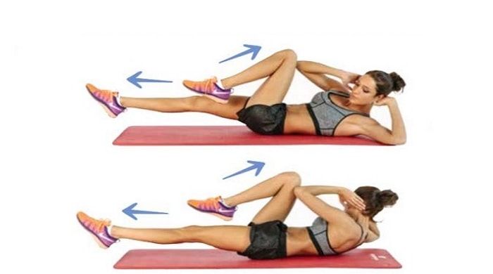 Комбинированные скручивания Это упражнение на пресс состоит из двух разных движений, объединенных в одно. Велосипед ногами и вращения тела с руками за головой. Получается очень мощное и эффективное упражнение, развивающее пресс, бедра, косые мышцы живота! Выполнение: