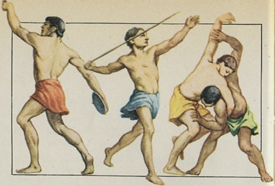 ![]() ![]() ![]() Проверка физических качеств в древности была связана с трудовой деятельностью, ритуальными практиками и социальными отношениями. Физические упражнения и состязания применялись в разных контекстах: в первобытном обществе, Древнем Египте, Древней Греции и на Руси. ◻В первобытном обществе ◾Трудовая деятельность. Охота, собирательство, изготовление орудий труда — все эти виды деятельности требовали значительной физической силы, выносливости и координации. «Естественная гимнастика» включала бег, прыжки, метание, лазание и плавание. ◾Ритуальные практики. Обряды инициации, посвящённые переходу юношей и девушек во взрослое состояние, часто включали сложные физические испытания, демонстрирующие силу, выносливость и готовность к выполнению социальных ролей. Например, обряд «инициации воина» предполагал прохождение серии испытаний: бег на длинные дистанции, борьба с другими юношами и метание копья на меткость. ◻В Древнем Египте ◾Военная подготовка. Применялись прикладные физические упражнения: верховая езда и езда на колесницах, фехтование, стрельба из лука, борьба, кулачный бой. ◾Религиозные культовые обряды. Физические упражнения были широко представлены в виде многообразных магических телодвижений, плясок, хороводов и игр. ◻В Древней Греции ◾Соревнования (агоны). Проводились ежегодно во всех греческих полисах, были непременной частью любого праздника и всегда проводились в присутствии зрителей. Некоторые из агонов переросли местное значение и приобрели общегреческий статус. ◾Система физического воспитания. Основу составляли бег, борьба, метание диска и копья, дополнялось охотой и военными играми. Практиковали боевые танцы, во время которых имитировался поединок с противником, умение управляться со щитом и копьём. ◻На Руси ◾Игрища — основная форма физического воспитания, связанная с культовыми обрядами. Составные элементы игрищ — песни, пляски, состязания в беге, прыжках, борьбе, метании копья, дротика, стрельбе из лука, кулачном бою и другие. ◾Состязания среди княжеской знати и дружинников. Например, князь Изяслав Мстиславович устроил в Киеве (1150) соревнования в верховой езде — конские ристания. | |